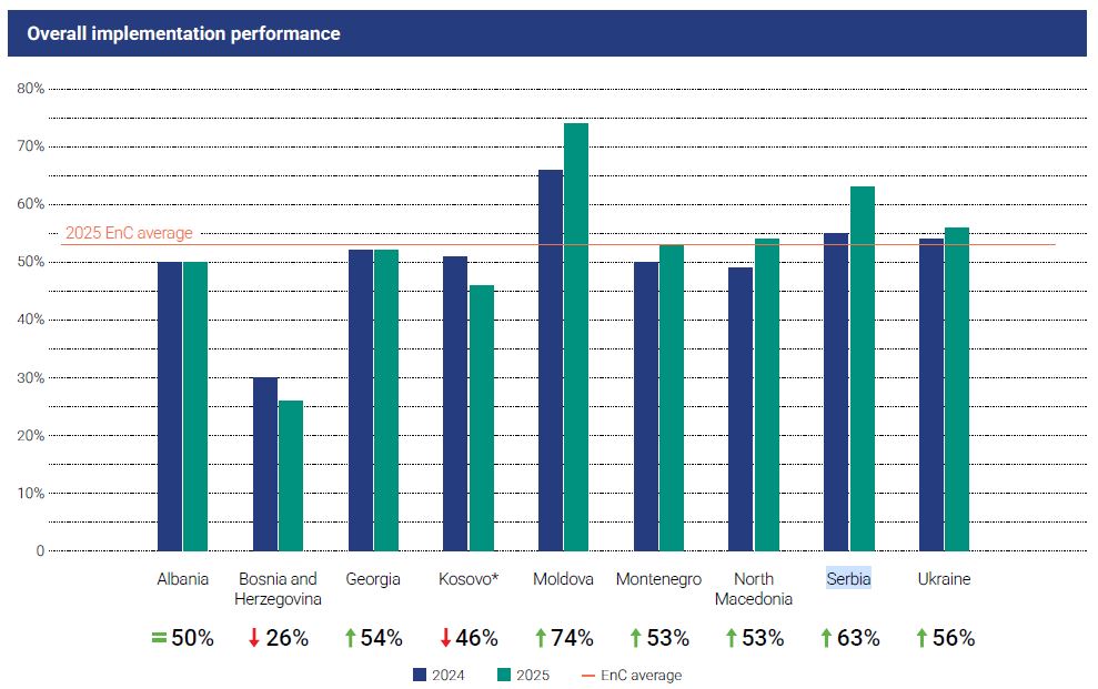 Srbija je nakon usvajanja novog Zakona o energetici krajem 2024. godine nastavila sa preuzimanjem mrežnih pravila i smjernica, dovršivši proces u avgustu 2025. Moldavija je u međuvremenu usvojila sve preostale mrežne kodekse, čime je takođe kompletirala EIP. Crna Gora i Sjeverna Makedonija napredovale su donošenjem novih zakona o energetici, dok zakoni pripremljeni u Bosni i Hercegovini i Ukrajini još čekaju parlamentarnu proceduru. Albanija, Gruzija i Kosovo* tek treba da naprave iskorak izvan izrade nacrta zakona.